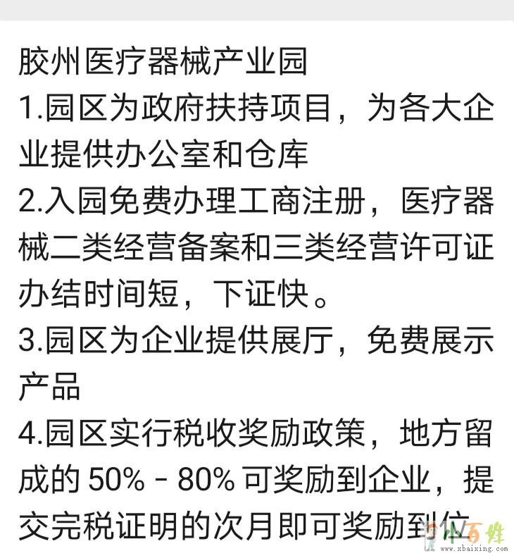 2.入园免费办理工商注册,医疗器械二类经营备案和三类经营许可证办结时间短,下证快。来源www.xbaixing.com